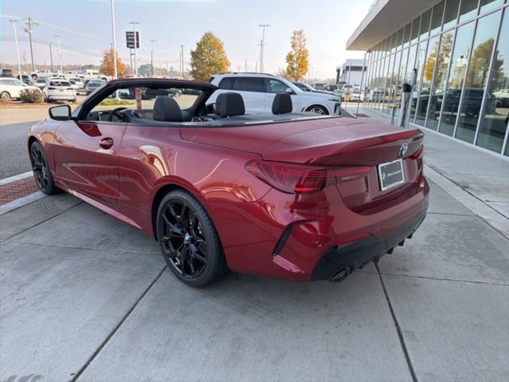 BMW of Tuscaloosa presents this 2026 BMW 4 Series 430i in Vegas Red Metallic exterior with Black interior. The Vehicle is equipped with M Sport Package, M Sport Package Pro, Parking Assistance Package (Parking Assistant Plus and Parking View with 3D View (Surround View)), Premium Package (BMW Curved Display with HUD, Harman/Kardon Surround Sound System, Heated Steering Wheel, and Remote Engine Start), Shadowline Package (Black Mirror Caps, Extended Shadowline Trim, Full LED Headlights with Laserlight Taillights, and M Shadowline Lights), Wheels: 19" x 8" M Dual-Spoke Jet Black, 10 Speakers, 4-Wheel Disc Brakes, 48V Mild Hybrid System, ABS brakes, Aerodynamic Kit, Air Conditioning, AM/FM Radio, AM/FM radio: SiriusXM with 360L, Apple CarPlay and Android Auto Compatibility, Audio memory, Auto High-beam Headlights, Auto-dimming door mirrors, Auto-dimming Rear-View mirror, Automatic temperature control, BMW Assist ECall, BMW TeleServices, Brake assist, Bumpers: body-color, Compass, ConnectedDrive Services, Convertible roof lining, Convertible roof wind blocker, Delay-off headlights, Driver door bin, Driver vanity mirror, Dual front impact airbags, Dual front side impact airbags, Electronic Stability Control, Emergency communication system: BMW Assist eCall, Exterior Parking Camera Rear, Four wheel independent suspension, Front anti-roll bar, Front Bucket Seats, Front Center Armrest, Front dual zone A/C, Front reading lights, Fully automatic headlights, Garage door transmitter, Genuine wood console insert, Genuine wood dashboard insert, Glass rear window, Heated door mirrors, Heated Front Seats, Heated front seats, Hi-Fi Sound System, HVAC memory, Illuminated entry, Integrated roll-over protection, Knee airbag, Leather steering wheel, Low tire pressure warning, Lumbar Support, M Sport Suspension, M Steering Wheel, Memory seat, Navigation, Navigation System, Occupant sensing airbag, Outside temperature display, Overhead console, Panic alarm, Passenger door bin, Passenger vanity mirror, Perforated SensaTec Upholstery, Personal ESIM 5G, Power convertible roof, Power door mirrors, Power driver seat, Power Front Seats, Power passenger seat, Power steering, Power windows, Radio data system, Rain sensing wipers, Rear anti-roll bar, Rear reading lights, Rear seat center armrest, Rear window defroster, Remote keyless entry, Security system, SensaTec Dashboard, Shadowline Exterior Trim, SiriusXM with 360L and 1 Year Trial Subscription, Speed control, Speed-sensing steering, Speed-Sensitive Wipers, Split folding rear seat, Sport Seats, Sport steering wheel, Steering wheel mounted audio controls, Tachometer, Telescoping steering wheel, Tilt steering wheel, Traction control, Trip computer, Turn signal indicator mirrors, Variable Sport Steering, Variably intermittent wipers, Widescreen Display, Wireless Device Charging, and Without Lines Designation Outside. Wheels: 19" x 8" M Dual-Spoke Jet Black.