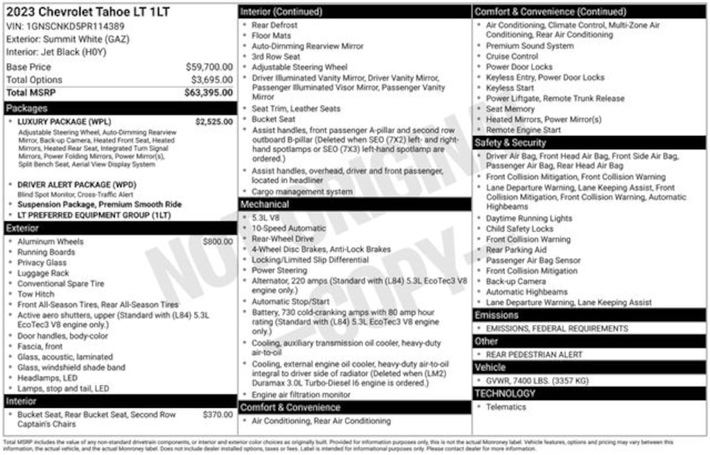 BMW of Tuscaloosa presents this 2023 Chevrolet Tahoe LT in Summit White exterior with Black interior. The Vehicle is equipped with Driver Alert Package (Lane Change Alert w/Side Blind Zone Alert and Rear Cross Traffic Alert), Luxury Package (2nd Row Pwr Release 60/40 Split-Folding Bench Seat, 3rd Row 60/40 Power-Folding Split-Bench Seat, HD Surround Vision, Heated 2nd Row Outboard Seats, Heated Steering Wheel, Memory Settings, Outside Heated Power-Adjustable Mirrors, Power Tilt & Telescopic Steering Column, and Rear Pedestrian Alert), Preferred Equipment Group 1LT (1st & 2nd Row Color-Keyed Carpeted Floor Mats, Auto-Dimming Inside Rear-View Mirror, Bose 9-Speaker Stereo Audio System Feature, Bright Front & Rear Door Sill Plates, Color-Keyed Carpeting Floor Covering, Driver & Front Outboard Passenger Airbags, Enhanced Driver Information Center, Floor Console w/Storage Area, Hands-Free Rear Power Programmable Liftgate, Infotainment Display, LED Daytime Running Lamps, Memory Settings for Driver, Remote Start, SiriusXM Radio w/360L, Universal Home Remote, Wireless Charging, and Wrapped Steering Wheel), Black Leather, 10-Way Power Driver & Passenger Seat Adjusters, 3.23 Rear Axle Ratio, 3rd row seats: split-bench, 4-Wheel Disc Brakes, 9 Speakers, ABS brakes, Air Conditioning, Alloy wheels, AM/FM radio: SiriusXM with 360L, Apple CarPlay/Android Auto, Auto High-beam Headlights, Auto-dimming Rear-View mirror, Automatic temperature control, Brake assist, Bumpers: body-color, Compass, Delay-off headlights, Driver door bin, Driver vanity mirror, Dual front impact airbags, Dual front side impact airbags, Electronic Stability Control, Emergency communication system: OnStar and Chevrolet connected services capable, Four wheel independent suspension, Front anti-roll bar, Front Bucket Seats, Front Center Armrest, Front dual zone A/C, Front High-Back Reclining Bucket Seats, Front reading lights, Fully automatic headlights, Garage door transmitter, Heated door mirrors, Heated Driver & Front Passenger Seats, Heated front seats, Illuminated entry, Leather-Appointed Seat Trim, Low tire pressure warning, Memory seat, Navigation System, Occupant sensing airbag, Outside temperature display, Overhead airbag, Overhead console, Panic alarm, Passenger door bin, Passenger vanity mirror, Power door mirrors, Power driver seat, Power Liftgate, Power passenger seat, Power Release 2nd Row Bucket Seats, Power steering, Power windows, Premium audio system: Chevrolet Infotainment 3 Premium, Premium Smooth Ride Suspension, Radio: Chevrolet Infotainment 3 Premium System, Rain sensing wipers, Rear air conditioning, Rear anti-roll bar, Rear reading lights, Rear seat center armrest, Rear window defroster, Rear window wiper, Remote keyless entry, Roof rack: rails only, Security system, Speed control, Speed-sensing steering, Split folding rear seat, Spoiler, Steering wheel mounted audio controls, Tachometer, Telescop