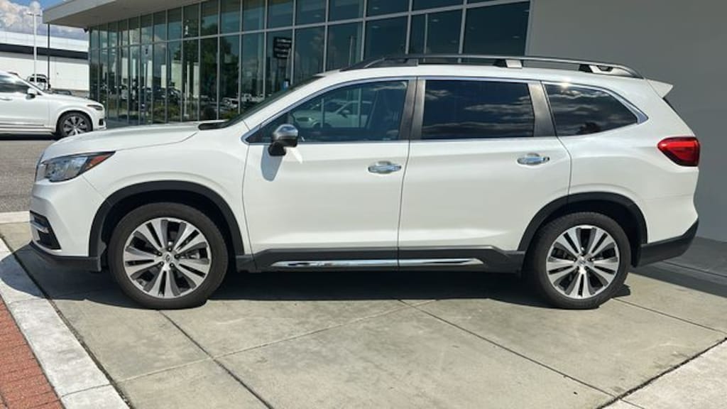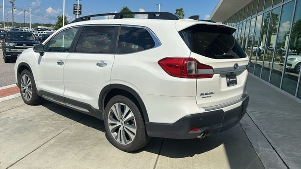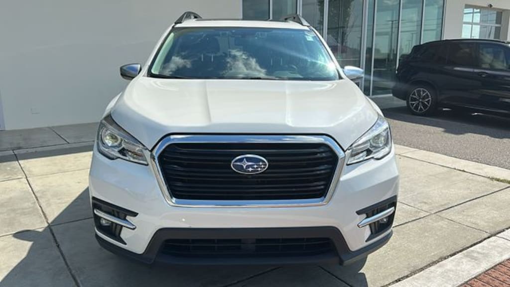 BMW of Tuscaloosa presents this 2021 Subaru Ascent Touring in Crystal White Pearl exterior with Slate Black interior. The Vehicle is equipped with Standard Model w/Slate Black Interior, Navigation System, 14 Speakers, 3rd row seats: bench, 3rd Row Sunshade, 4-Wheel Disc Brakes, ABS brakes, Air Conditioning, Alloy wheels, AM/FM radio: SiriusXM, Auto High-beam Headlights, Auto-Dimming Exterior Mirror w/Approach Light, Auto-dimming Rear-View mirror, Automatic temperature control, Axle Ratio: 4.44, Brake assist, Bumpers: body-color, Cargo Net, Cargo Tray, CD player, Compass, Cup Holder Insert, Delay-off headlights, Driver door bin, Driver vanity mirror, Dual front impact airbags, Dual front side impact airbags, Electronic Stability Control, Emergency communication system: STARLINK Safety and Security (Subscription Required), Exterior Parking Camera Rear, Four wheel independent suspension, Front anti-roll bar, Front Bucket Seats, Front Center Armrest, Front dual zone A/C, Front fog lights, Front reading lights, Fully automatic headlights, Garage door transmitter: HomeLink, harman/kardon® Speakers, Heated & Ventilated Front Bucket Seats, Heated door mirrors, Heated front seats, Heated rear seats, Heated steering wheel, Illuminated entry, Knee airbag, Low tire pressure warning, Map & Reading Lights LED Upgrade - 6 Bulb Kit, Memory seat, Occupant sensing airbag, Outside temperature display, Overhead airbag, Overhead console, Panic alarm, Passenger door bin, Passenger vanity mirror, Perforated Leather-Trimmed Upholstery, Power door mirrors, Power driver seat, Power Liftgate, Power moonroof, Power passenger seat, Power steering, Power windows, Radio data system, Radio: Subaru STARLINK 8.0" Multimedia Nav System, Rain sensing wipers, Rear air conditioning, Rear anti-roll bar, Rear Bumper Cover, Rear reading lights, Rear window defroster, Rear window wiper, Reclining 3rd row seat, Remote keyless entry, Security system, Speed control, Split folding rear seat, Spoiler, STARLINK/Apple CarPlay/Android Auto, Steering wheel mounted audio controls, Tachometer, Telescoping steering wheel, Tilt steering wheel, Traction control, Trip computer, Turn signal indicator mirrors, Variably intermittent wipers, Ventilated front seats, Wheels: 20" x 7.5 J Dk Gray Alloy w/Machine Finish, and Windshield Sunshade.
