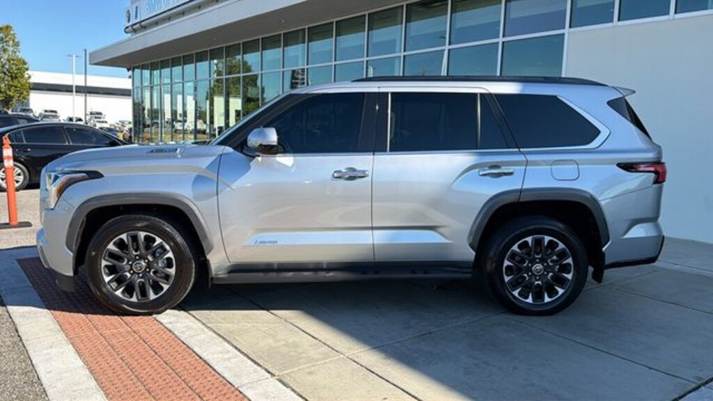 BMW of Tuscaloosa presents this 2023 Toyota Sequoia Limited in Celestial Silver Metallic exterior with Boulder interior. The Vehicle is equipped with Tow Technology Package, V6 Hybrid, 10-Speed Automatic, 4WD, Apple CarPlay/Android Auto, Auto High-beam Headlights, Heated & Ventilated Front Seats, Heated front seats, Navigation system: Drive Connect (1 year trial) includes Cloud Navigation with real time traffic and Google POI, Power Liftgate, Power moonroof, 3.31 Axle Ratio, 3rd row seats: split-bench, 4-Wheel Disc Brakes, 8 Speakers, ABS brakes, Air Conditioning, Alloy wheels, AM/FM radio: SiriusXM, Anti-whiplash front head restraints, Auto-dimming door mirrors, Auto-dimming Rear-View mirror, Automatic temperature control, Brake assist, Bumpers: body-color, Delay-off headlights, Driver door bin, Driver vanity mirror, Dual front impact airbags, Dual front side impact airbags, Electronic Stability Control, Emergency communication system: Safety Connect (10-year trial), Front anti-roll bar, Front Bucket Seats, Front Center Armrest w/Storage, Front dual zone A/C, Front fog lights, Front reading lights, Front wheel independent suspension, Fully automatic headlights, Garage door transmitter: HomeLink, Headlight cleaning, Heated door mirrors, Heated steering wheel, Illuminated entry, JBL 14 Speakers, Knee airbag, Leather Shift Knob, Leather steering wheel, Low tire pressure warning, Memory seat, Occupant sensing airbag, Outside temperature display, Overhead airbag, Overhead console, Panic alarm, Passenger door bin, Passenger vanity mirror, Power door mirrors, Power driver seat, Power passenger seat, Power steering, Power windows, Radio: Toyota Multimedia w/14" Display, Rear air conditioning, Rear reading lights, Rear seat center armrest, Rear window defroster, Rear window wiper, Reclining 3rd row seat, Remote keyless entry, Security system, SofTex Seat Trim, Speed control, Speed-sensing steering, Split folding rear seat, Spoiler, Steering wheel mounted audio controls, Tachometer, Telescoping steering wheel, Tilt steering wheel, Traction control, Trip computer, Turn signal indicator mirrors, Variably intermittent wipers, Ventilated front seats, Voltmeter, Wheels: 20" Machined-Finish Alloy, and Wireless Smartphone Charger.